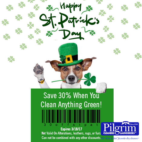 Get your green garments ready for St Patrick’s Day on Friday! Bring them in to any of our 25 Pilgrim Cleaners locations for FREE Same Day Service & save 30% now through Saturday! Present this coupon at time of order drop off to receive discount.